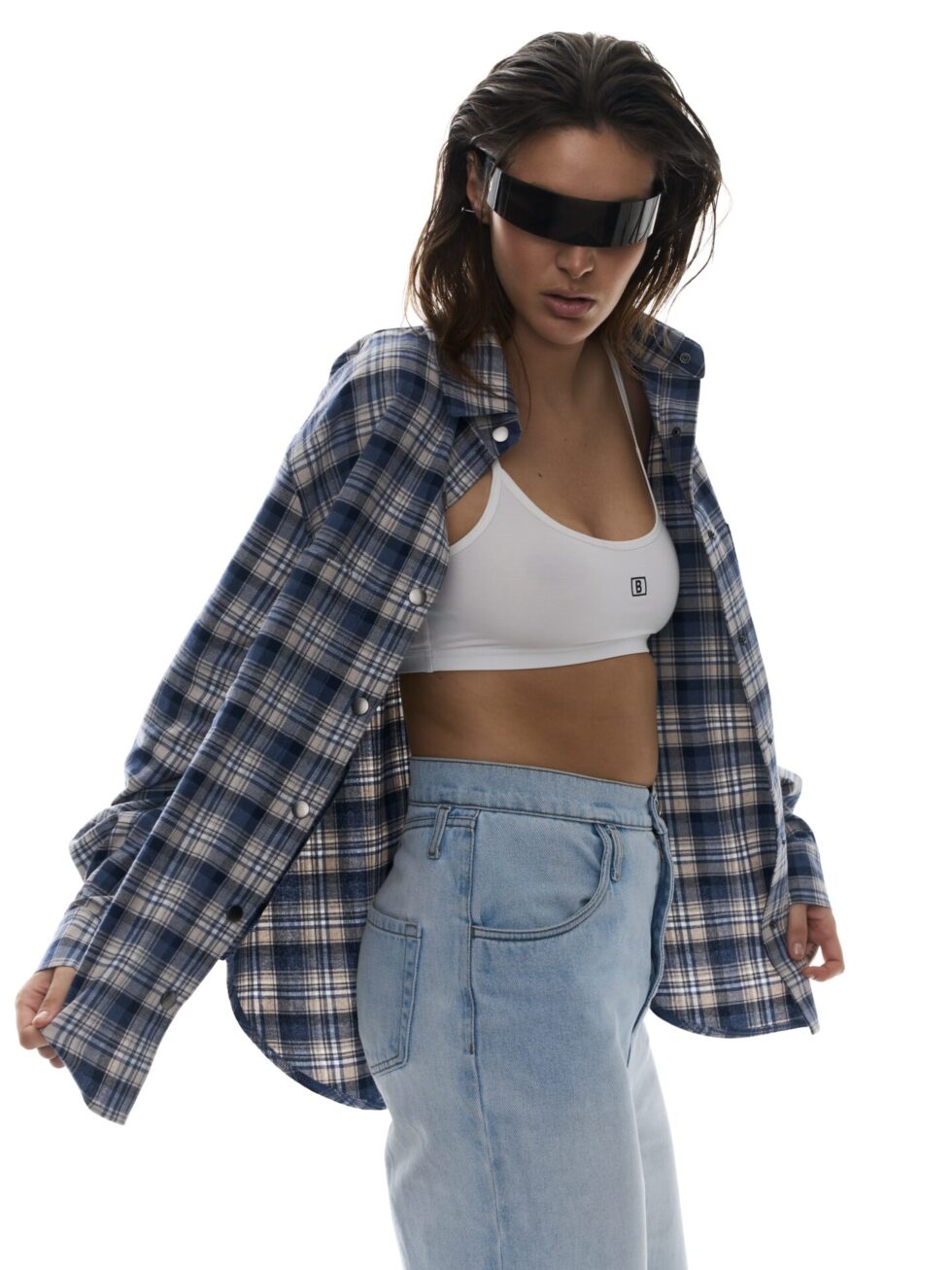 - Стильна сорочка вільного крою в клітинку з принтом BALANCE на спині.