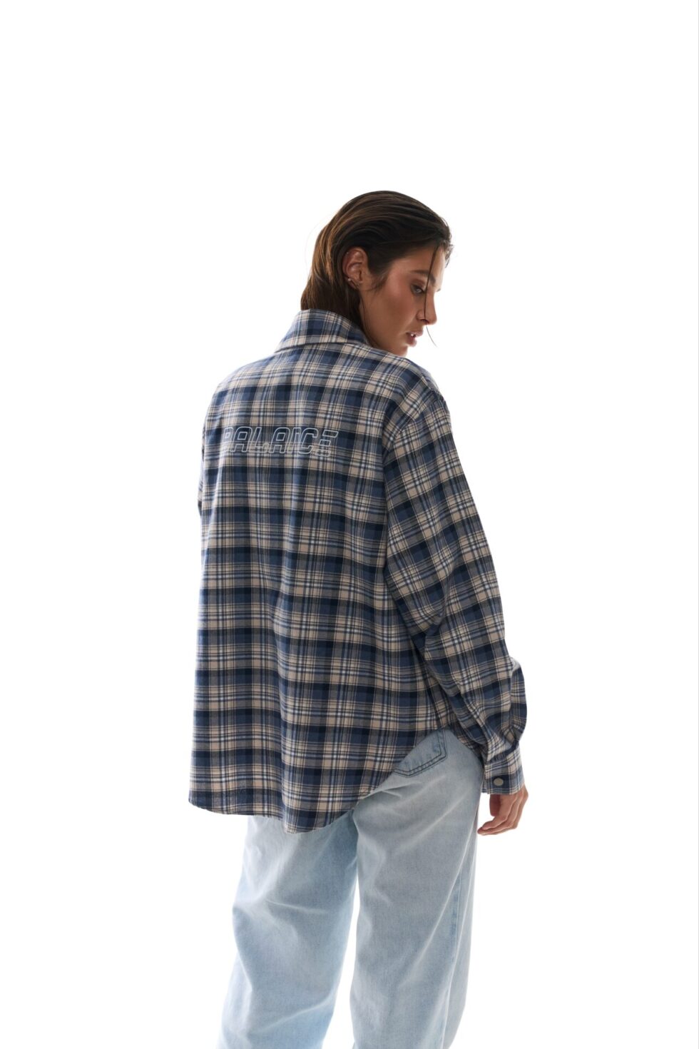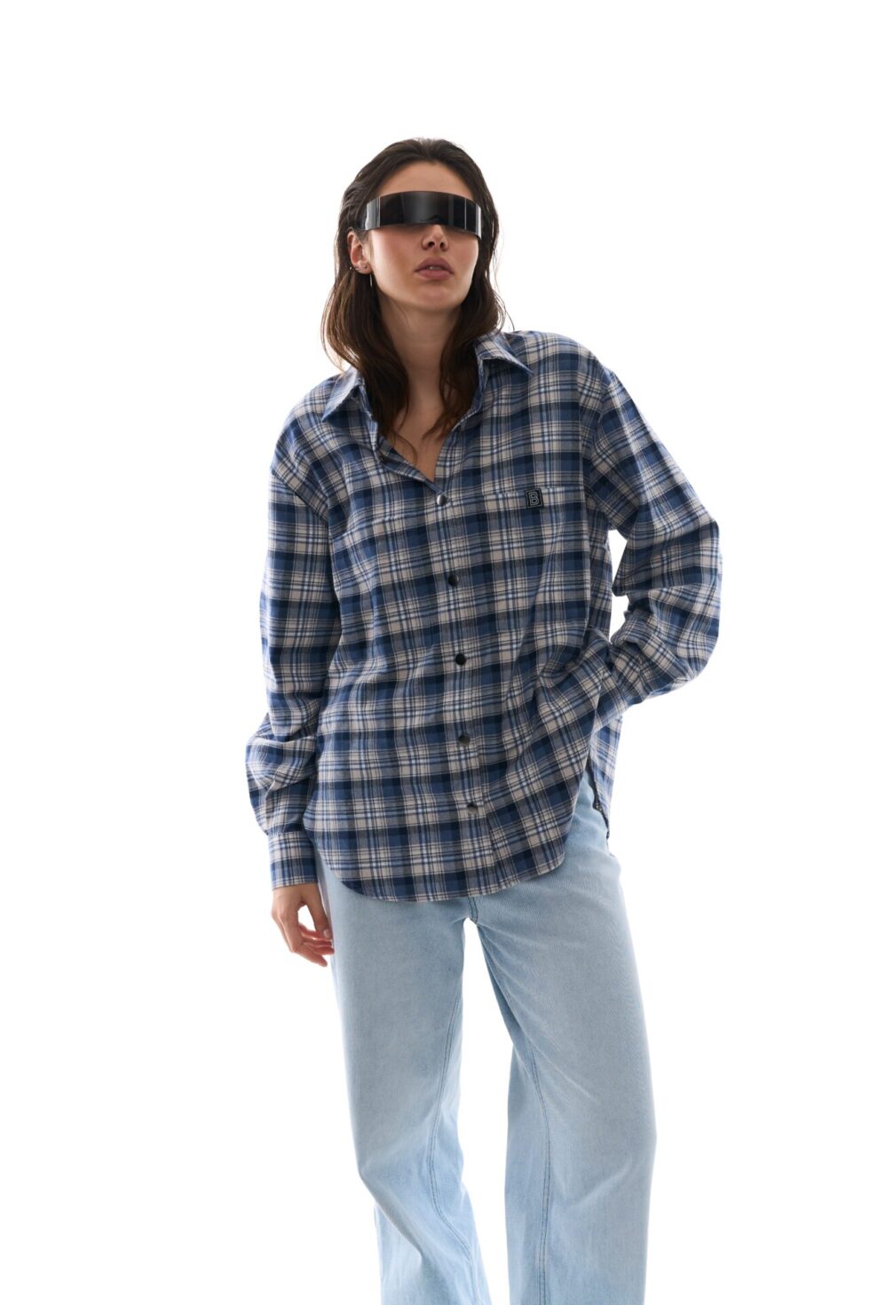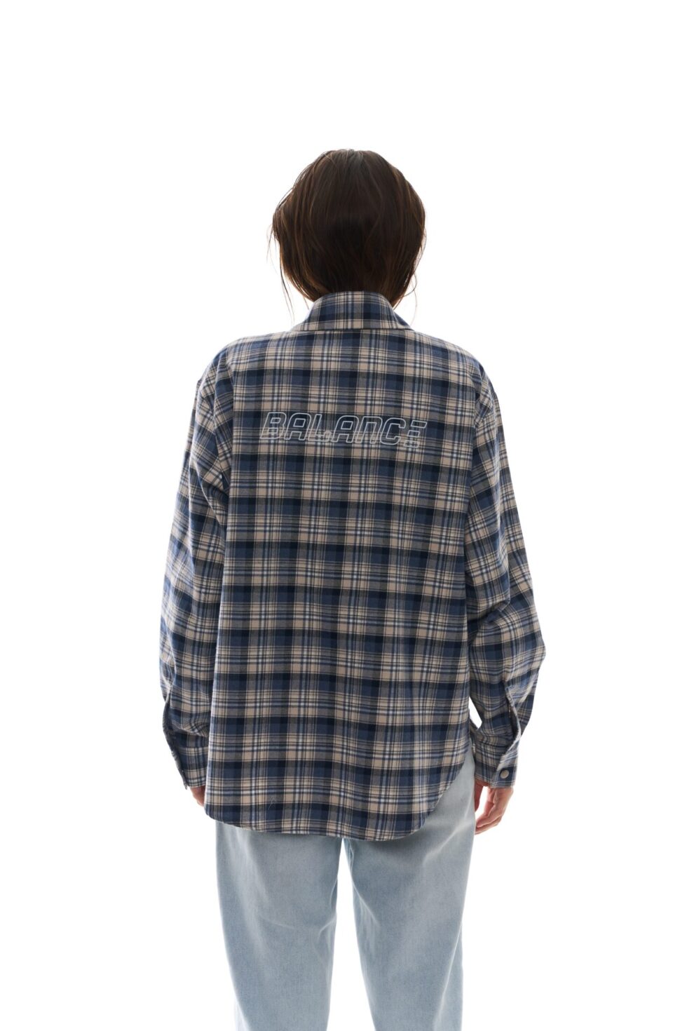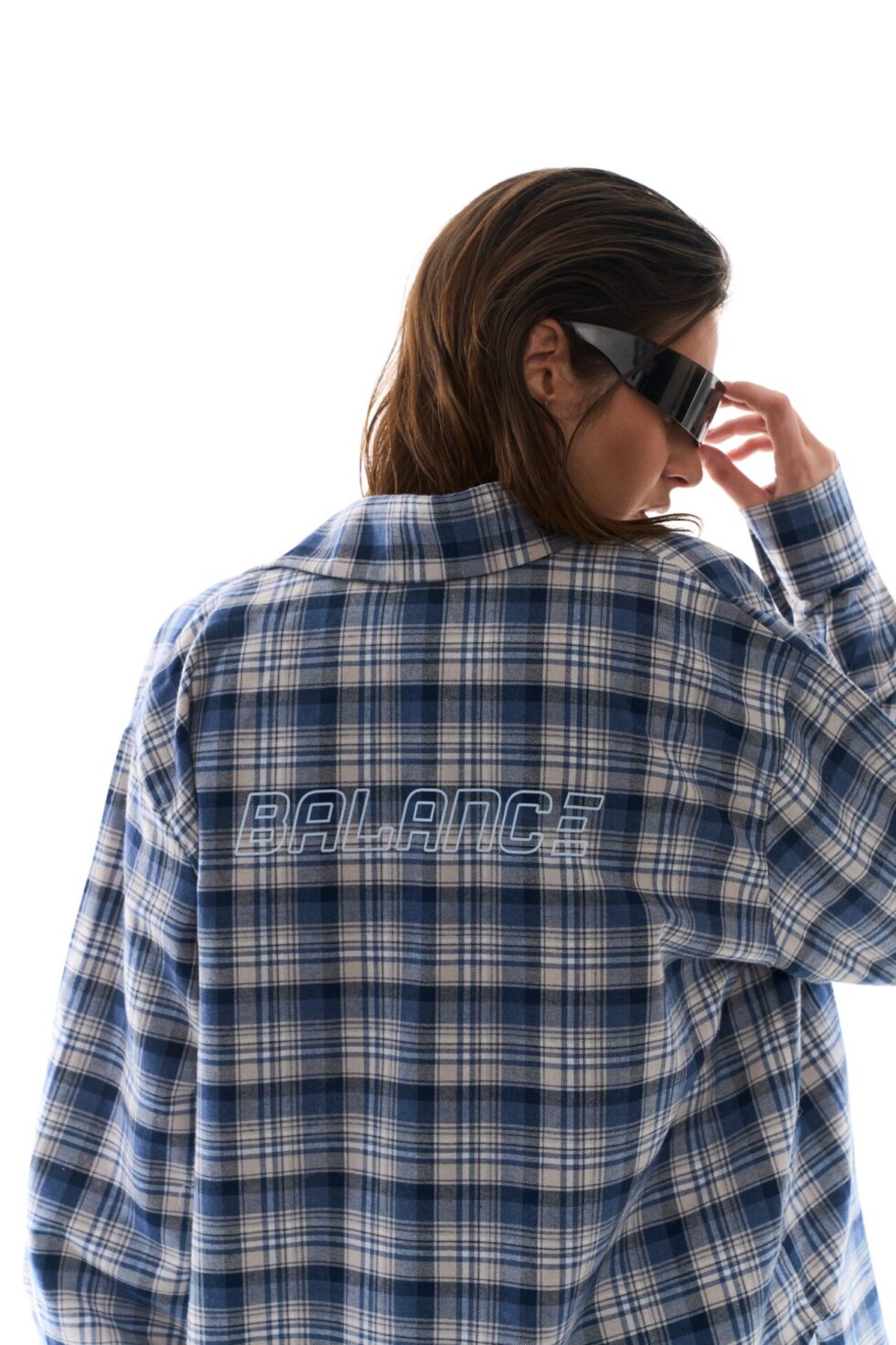 - Стильна сорочка вільного крою в клітинку з принтом BALANCE на спині.