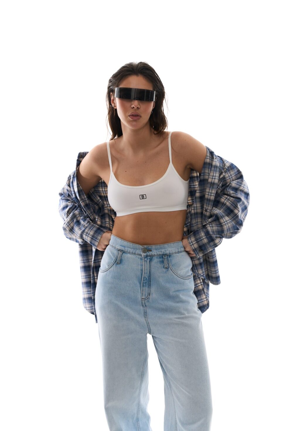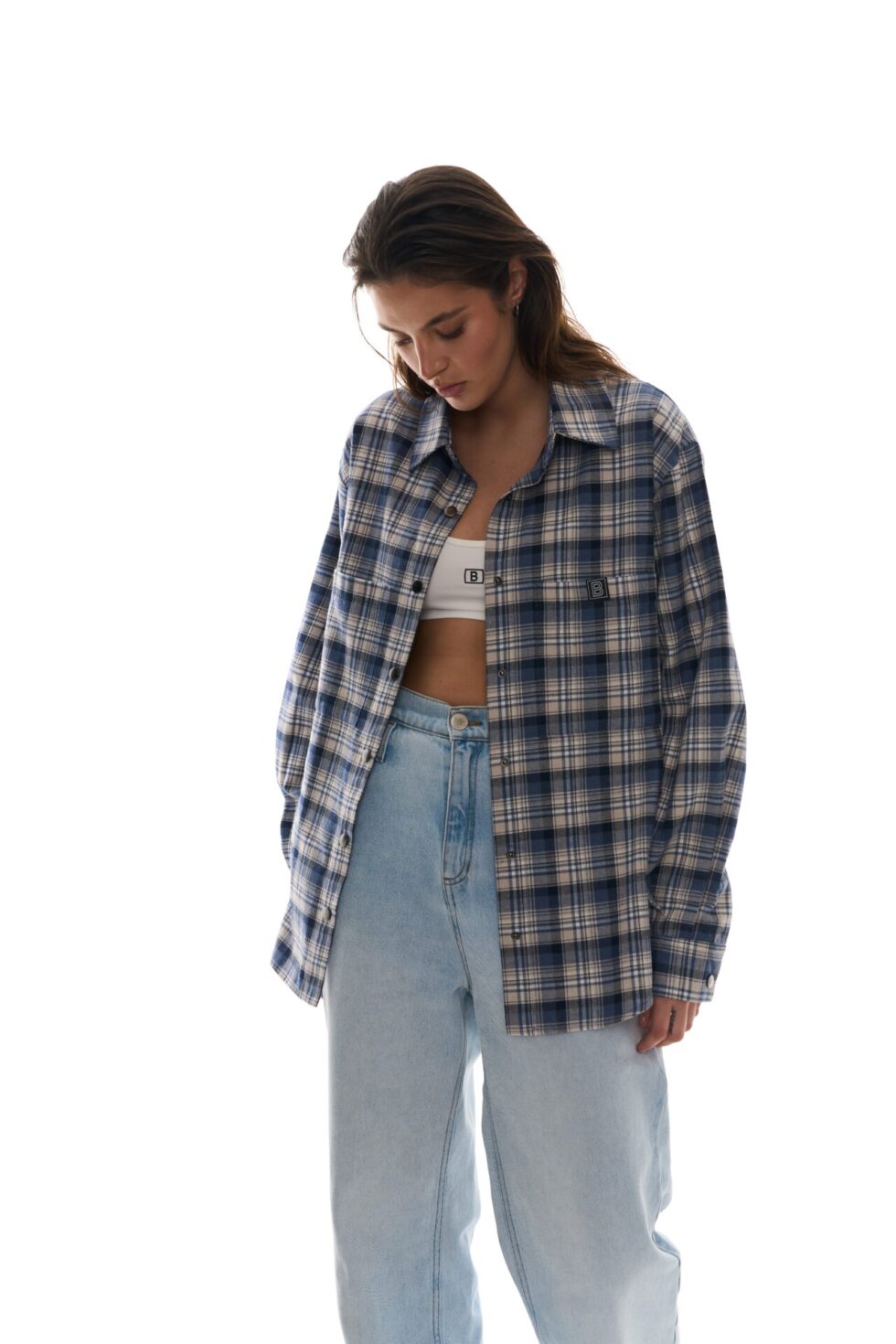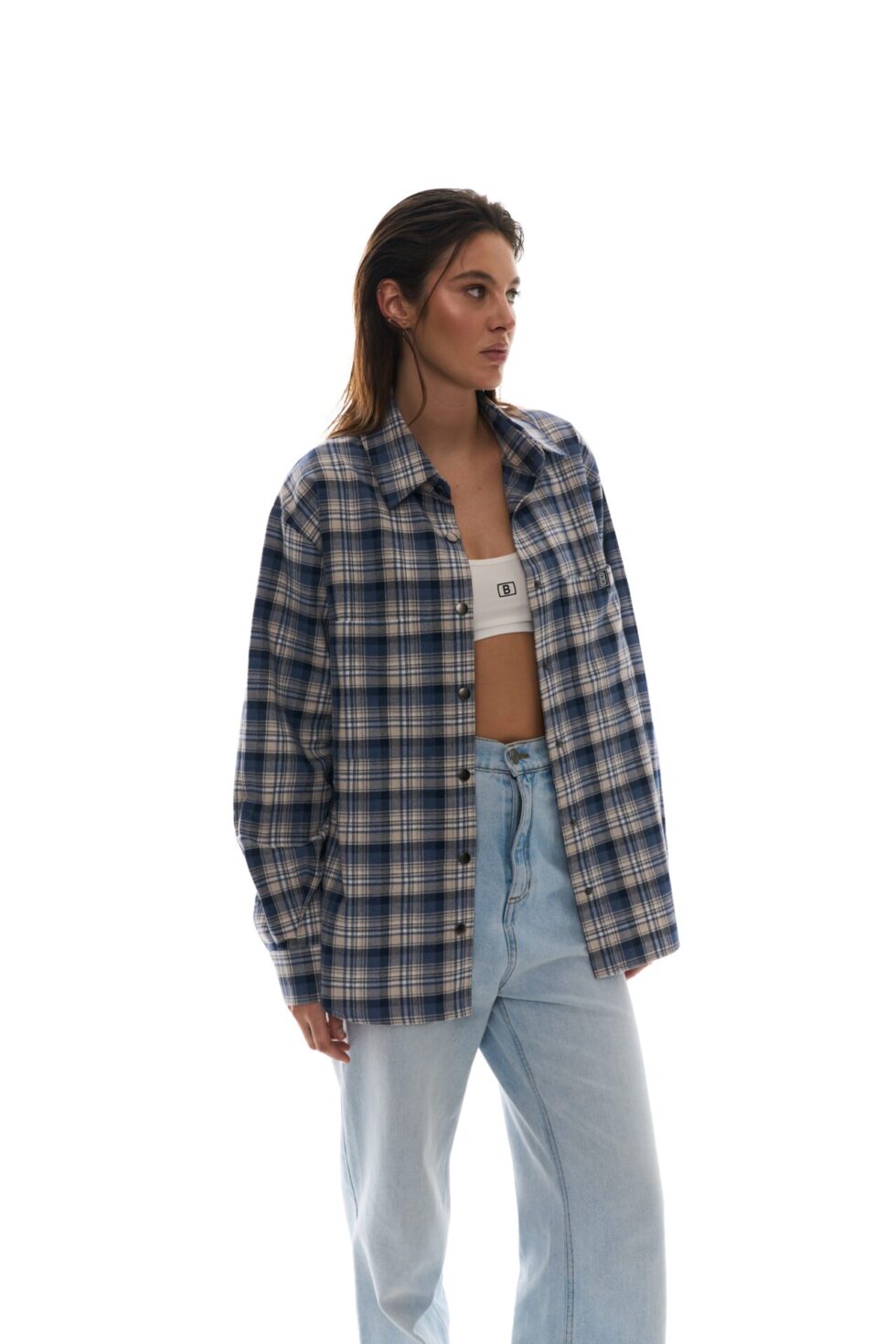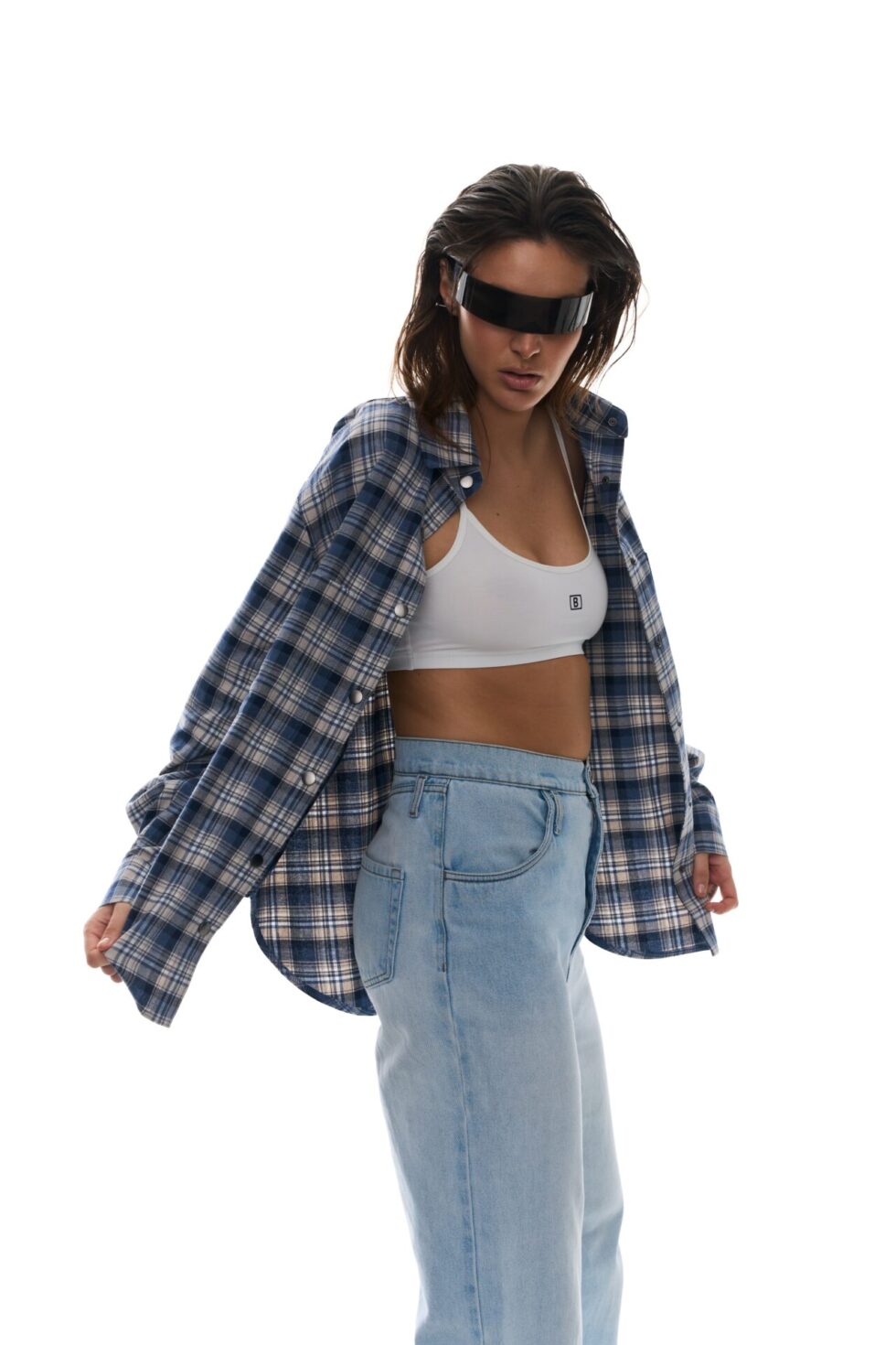 - Стильна сорочка вільного крою в клітинку з принтом BALANCE на спині.