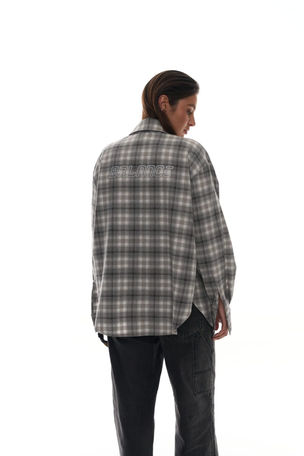 - Стильна сорочка вільного крою в клітинку з принтом BALANCE на спині.